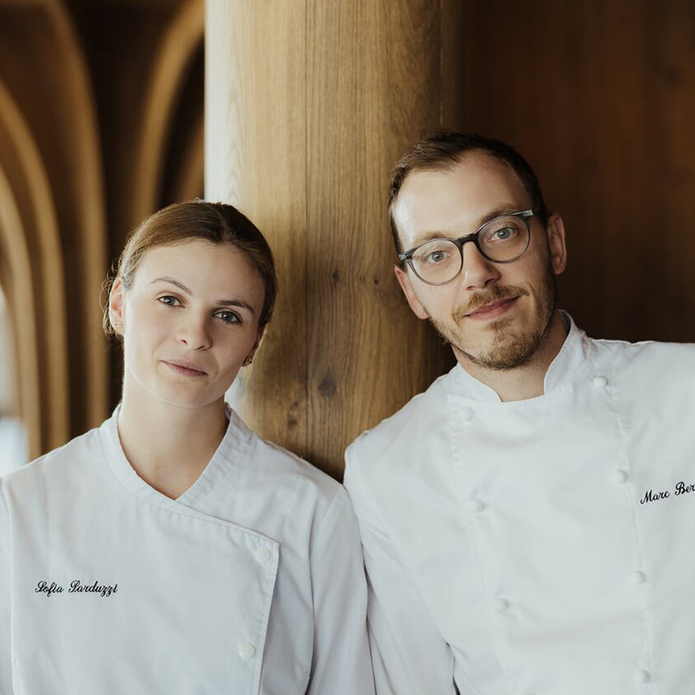 Coppia sul lavoro e nella vita, Sofia (classe 1998) e Marc (1991) sono i due giovani chef, entrambi altoatesini, che da pochi mesi hanno preso le redini delle cucine al prestigioso Hotel Gran Baita Dolomites a Selva di Val Gardena, incluso il ristorante Gourmet. Dopo diverse esperienze in cucine di alto livello, prima di rientrare in Italia hanno gestito per qualche anno un ristorante in Lussemburgo. Se Marc è cresciuto in questa valle e ne interpreta in maniera fedele gli ingredienti tipici, Sofia è bravissima a preparare la pasta fresca. La combinazione del loro talento si traduce in piatti che uniscono tradizione locale e influenze internazionali.