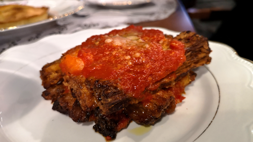 Tra gli antipasti, l’Acquacotta è un insieme delicato di ingredienti decisi, con una spiccata nota vegetale. Questa ricetta povera, ma gustosa, che viene dalla Maremma, ci è piaciuta molto. La parmigiana di cardi è, senza troppi giri di parole, un caterpillar di sapori diretti, con una consistenza davvero appagante. La torta di faraona e cavolo nero è sorprendente, mentre le Stigghiole siciliane sono per palati veterani. La misticanza, con la quale vengono servite proprio le Stigghiole, andrebbe inserita nei contorni. Tra i primi spiccano le Chitarrine cacio e ova, con carne di pecora, che personalmente sono state un vero tuffo in un’adolescenza abruzzese; le tagliatelle al ragù bolognese hanno un gusto pieno, mentre la pasta e fagioli ha nei maltagliati un punto di forza assolutamente di livello.