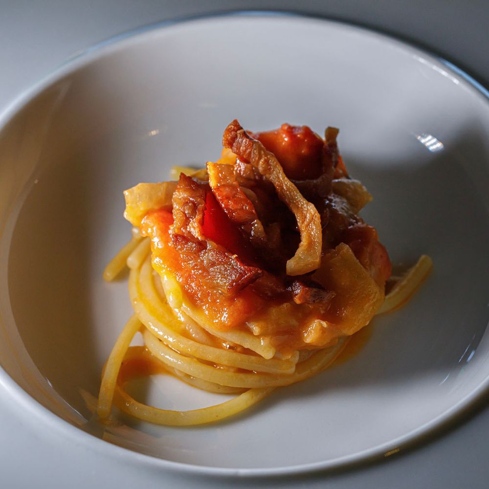 Mare, ma non solo, anche carne: spaghettone guanciale, pecorino e pomodoro o l’ossobuco in Versilia, vitello, midollo, zafferano.